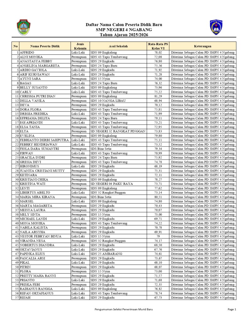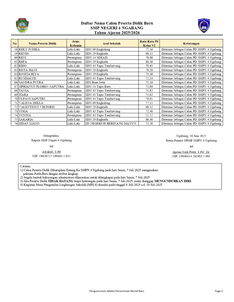 - 1Calon Peserta Didik Diharapkan Datang Ke SMPN 4 Ngabang pada hari Senin, 7 Juli 2025 mengenakan pakaian SD (Putih-Merah) dengan atribut lengkap